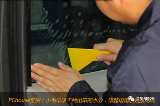 膜分两层,一层为无色透明的称为保护膜,一层有粘性带颜色的称之为贴膜。上膜前首先喷润滑液降低胶层粘性, 然后一边撕保护膜一边上膜,调整好薄膜在玻璃窗上的位置,动作是先打十字,然后从中间到两边刮膜,将薄膜固定,把气泡从两边赶出,用力要轻,避免用力过大将薄膜刮花。